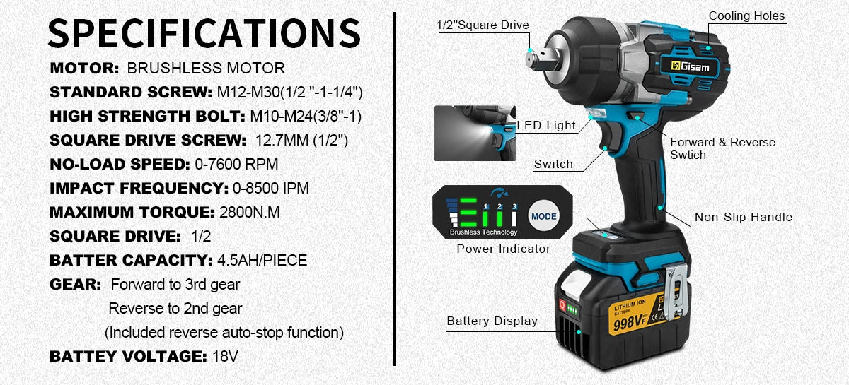 Gisam akumulátorový rázový utahovák 2800 Nm 2x baterie 18V + kufr