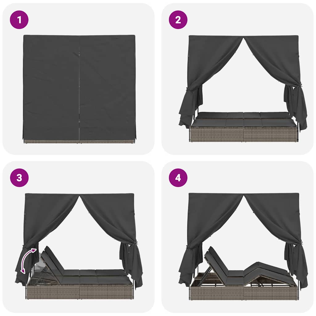 Mrkni na tohle skvělý venkovní dvojité lehátko se střechou a závěsy – je to ideální pro lenošení venku. Představ si, jak si užíváš sluneční paprsky na krásném ránu nebo se uvolňuješ v příjemném večeru, a to všechno v pohodlí a stínu díky tomuhle parádnímu lehátku. Má elegantní design a variabilní uspořádání, takže je super volba na zahrady nebo terasy, a poskytne ti skvělý zážitek venku.
